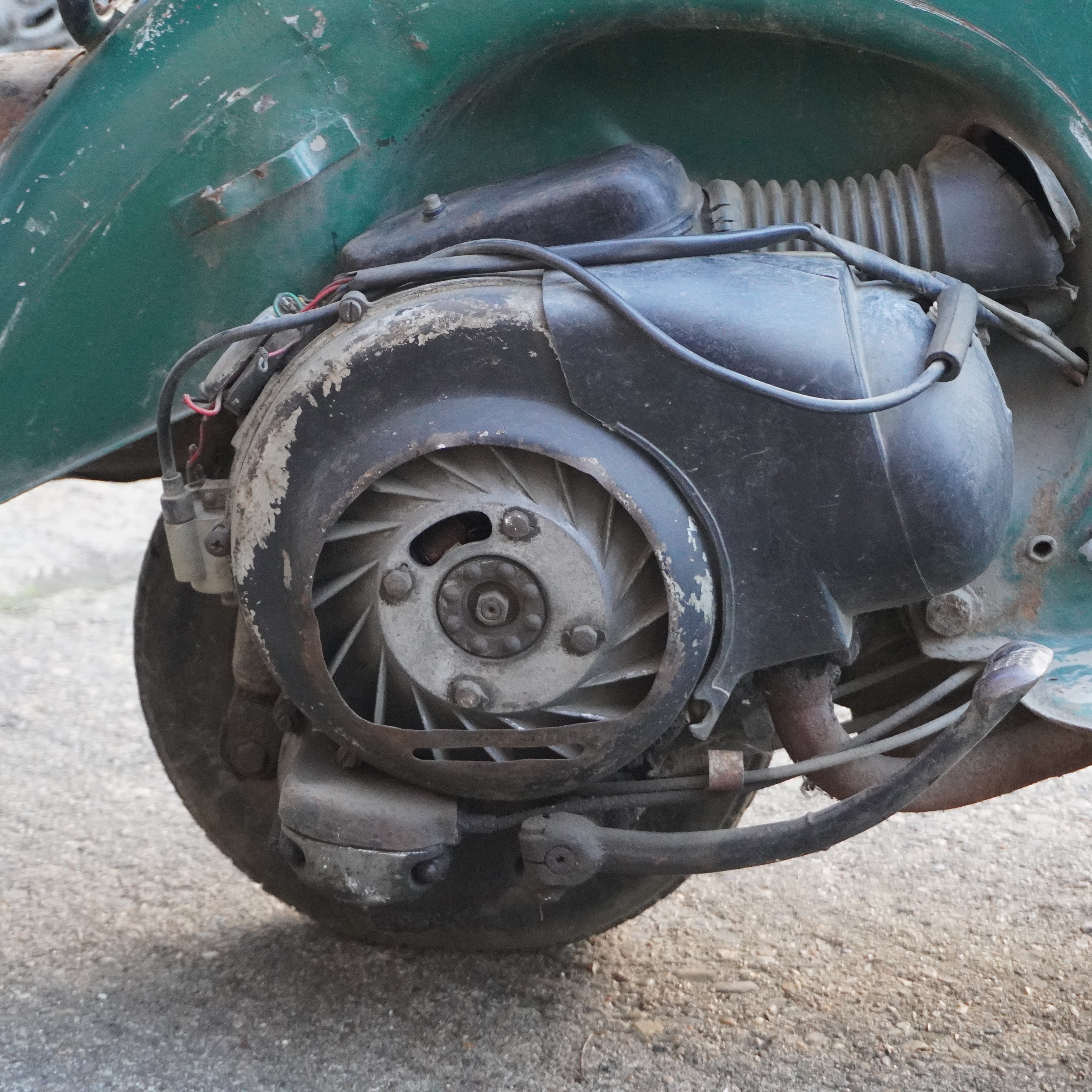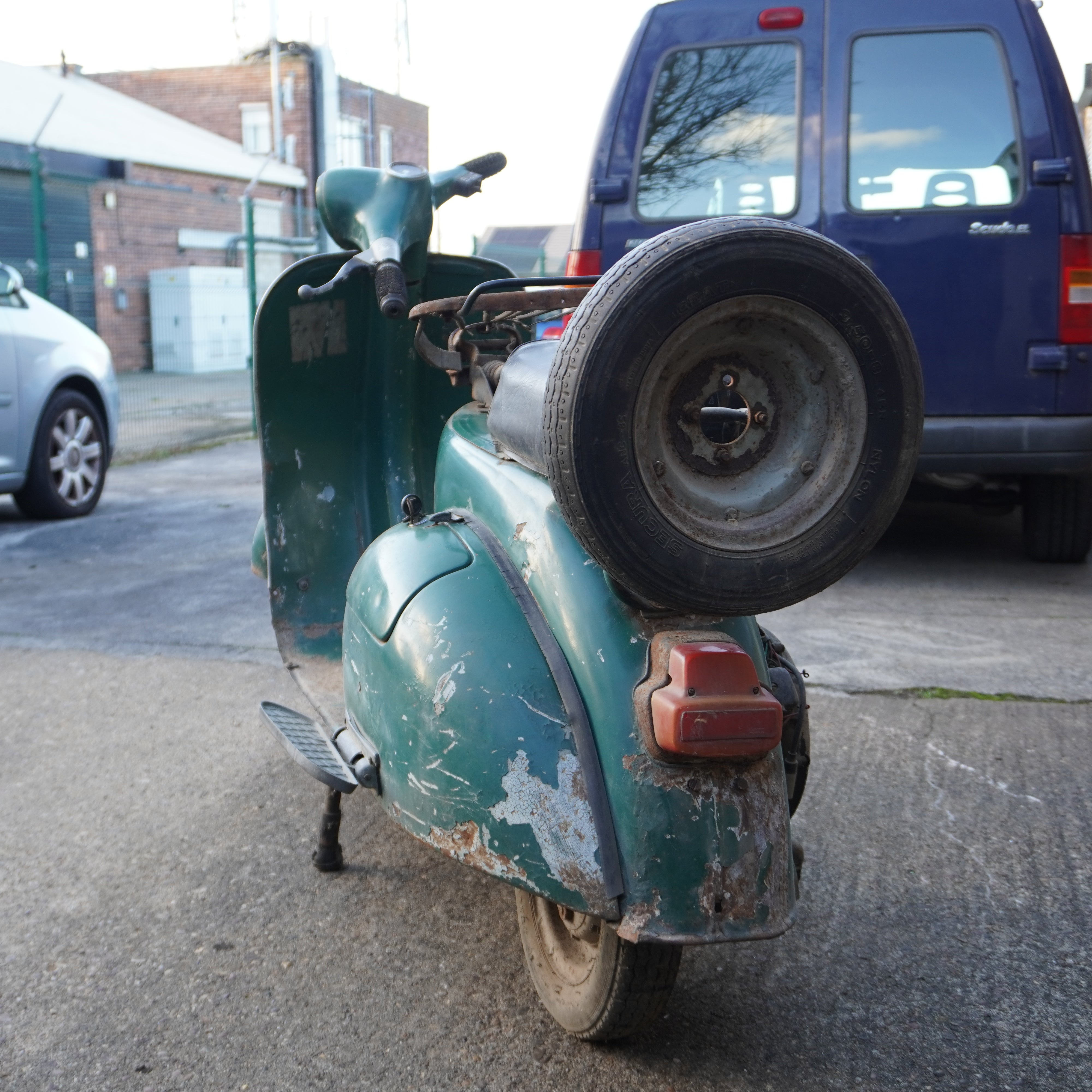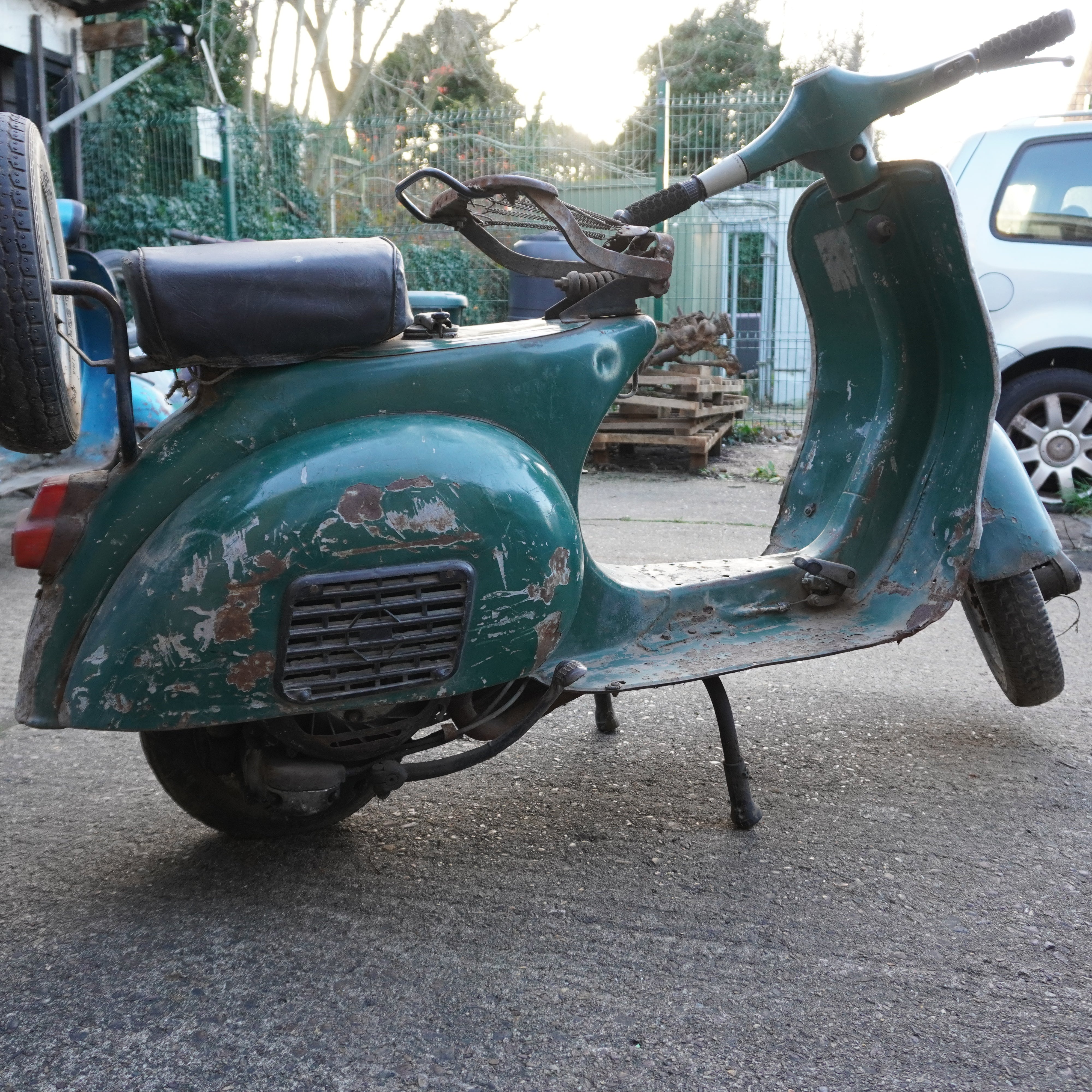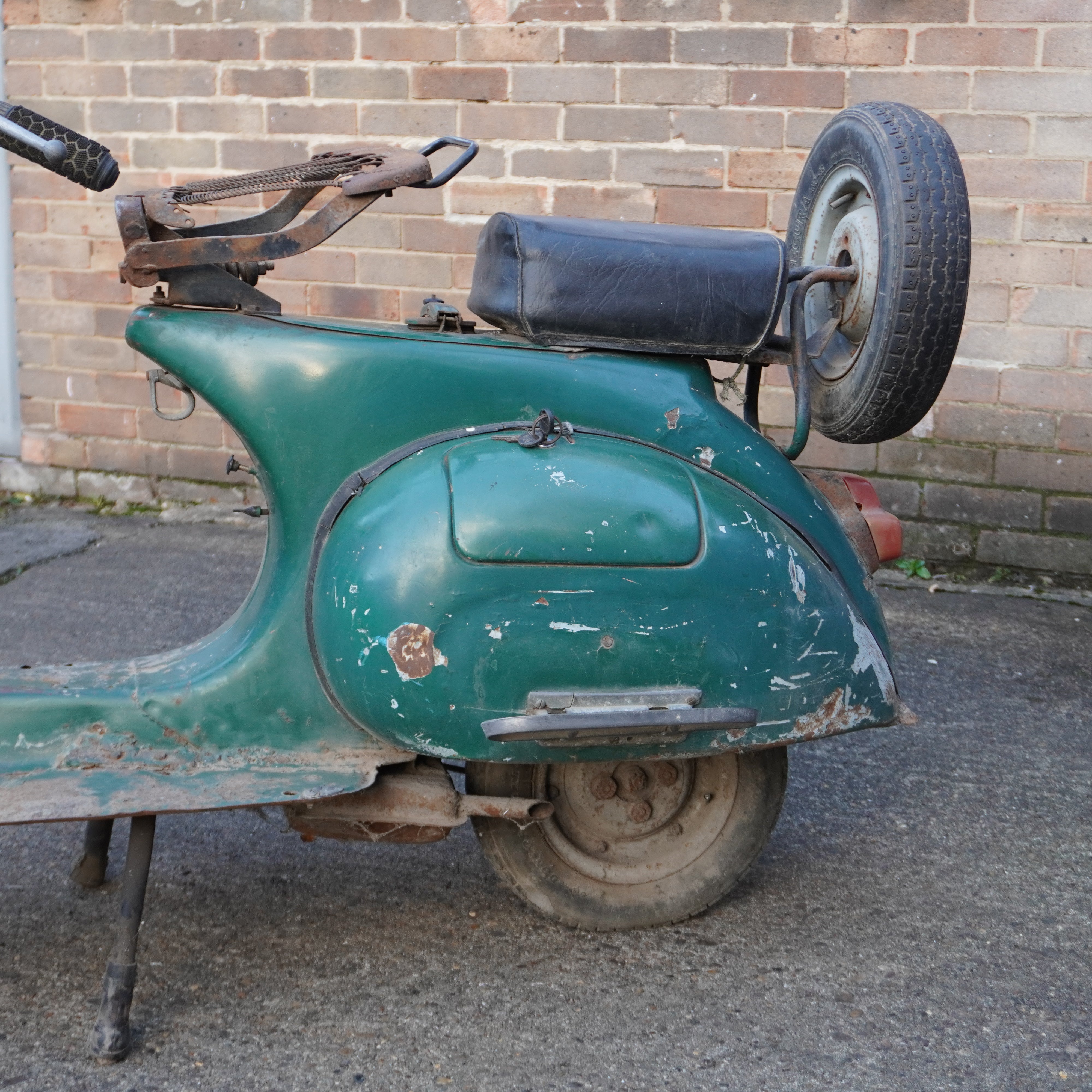 Scooter painted green and in fair condition but will need the frame welding to repair any damage and will need a lot of work but would make an excellent project for restoration.