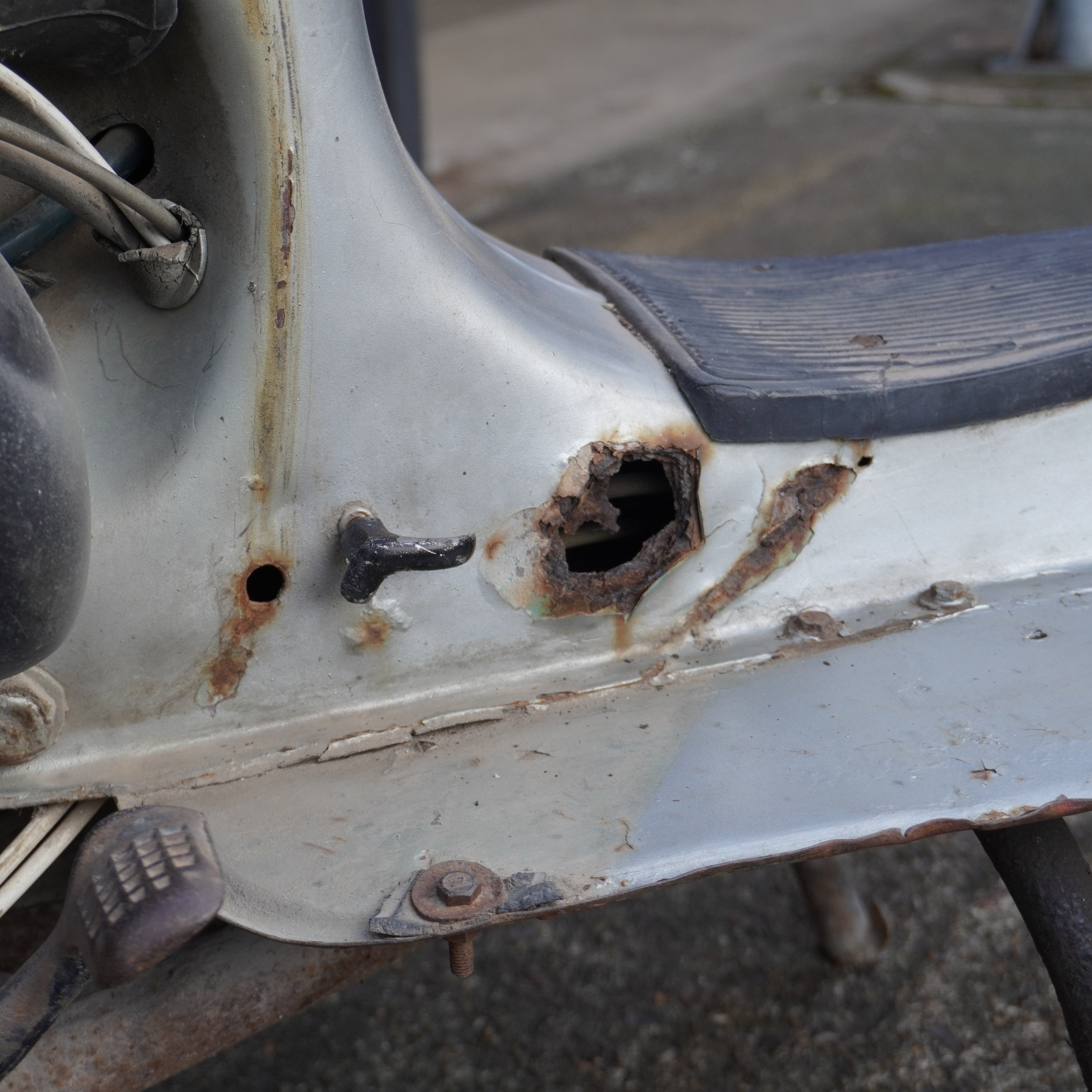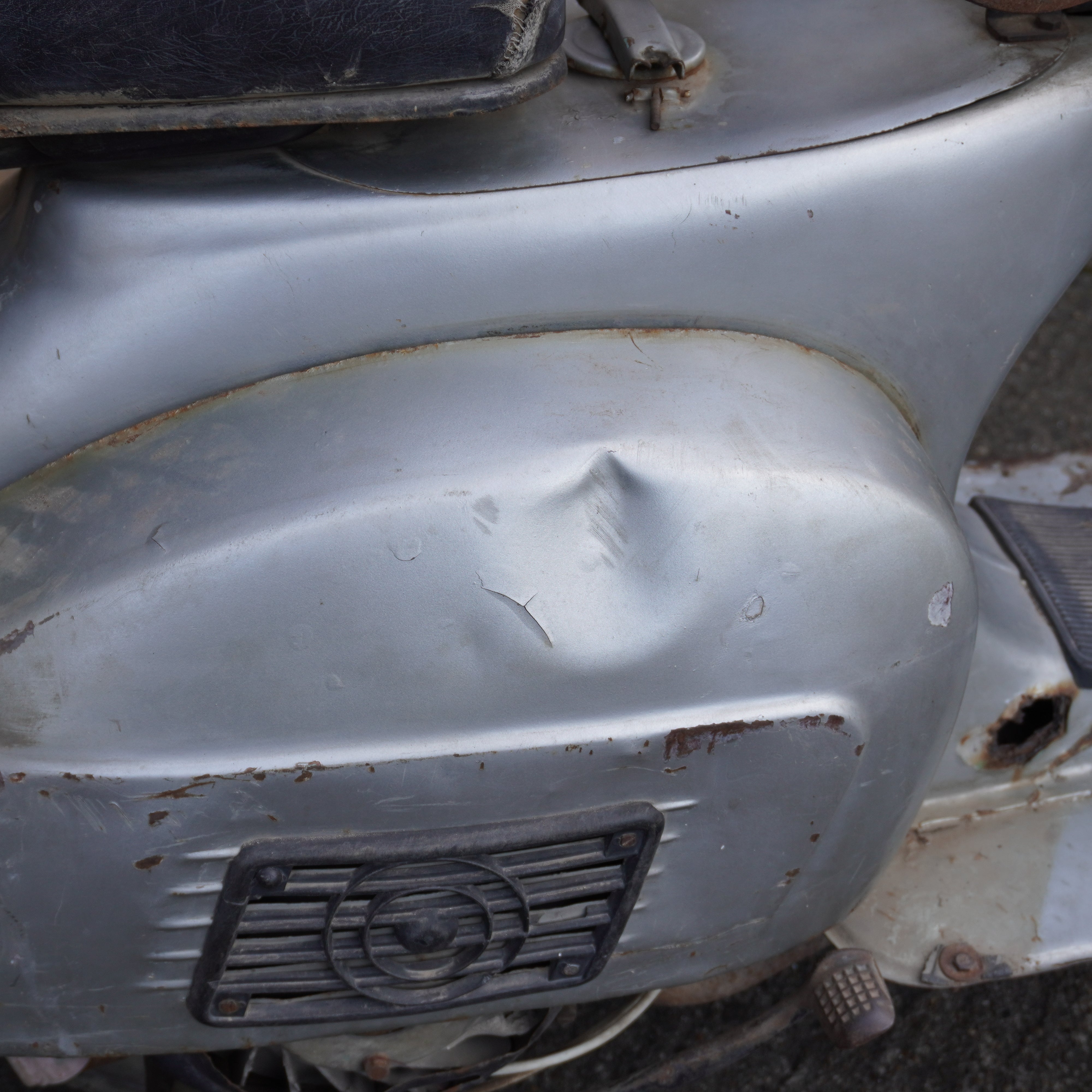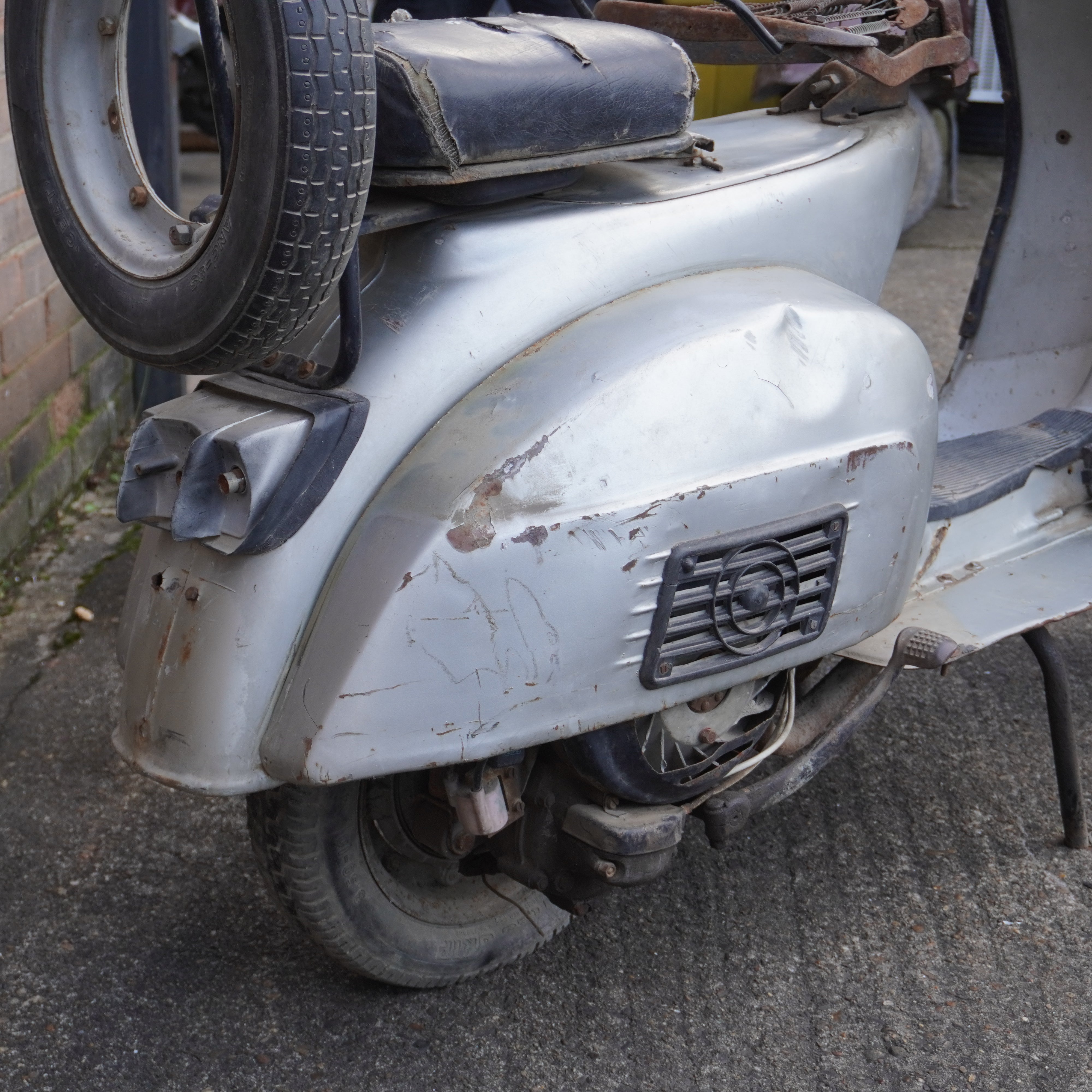 Scooter painted red and in fair condition but will need the frame welding to repair any damage and will need a lot of work but would make an excellent project for restoration.