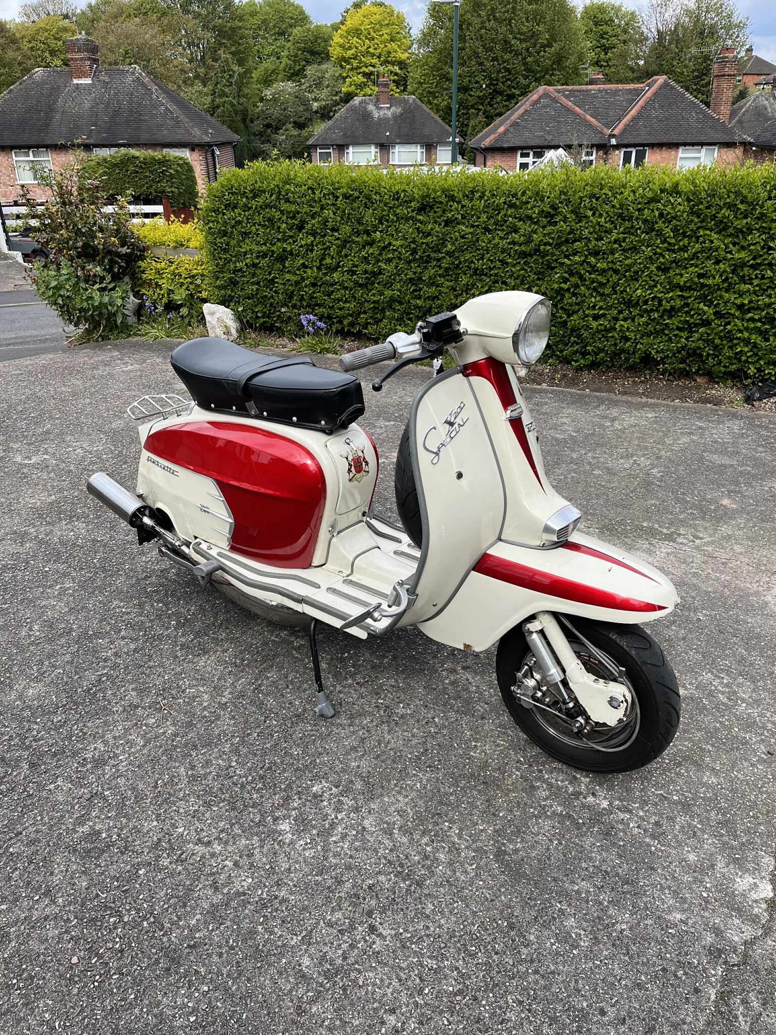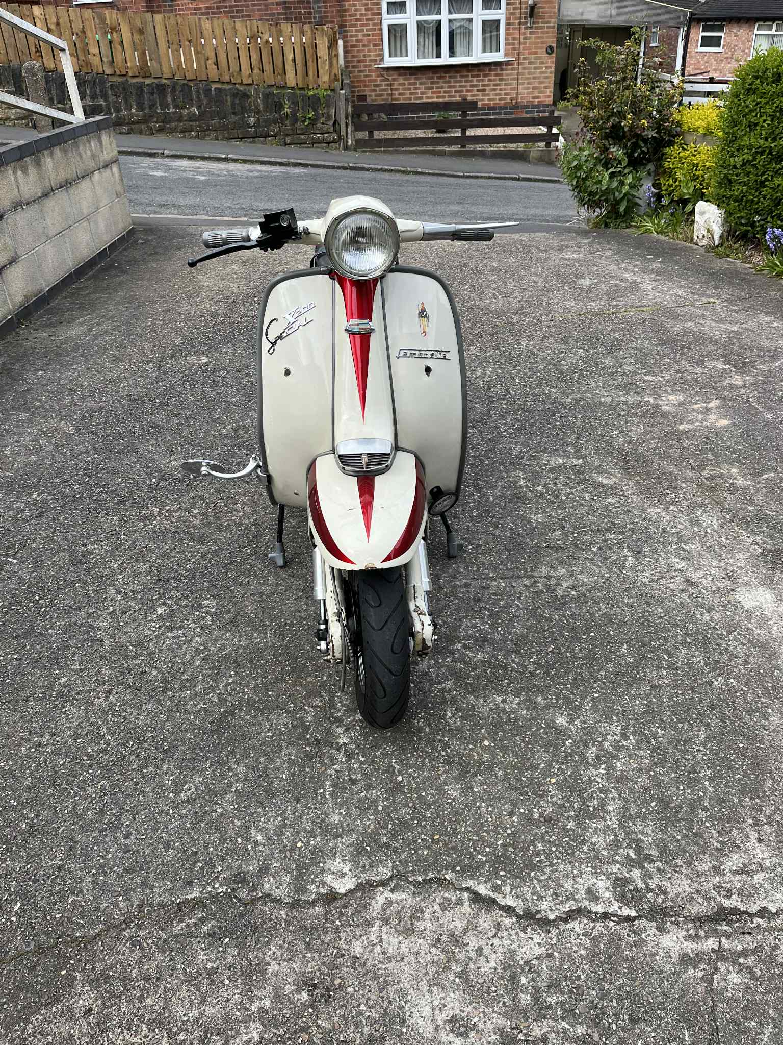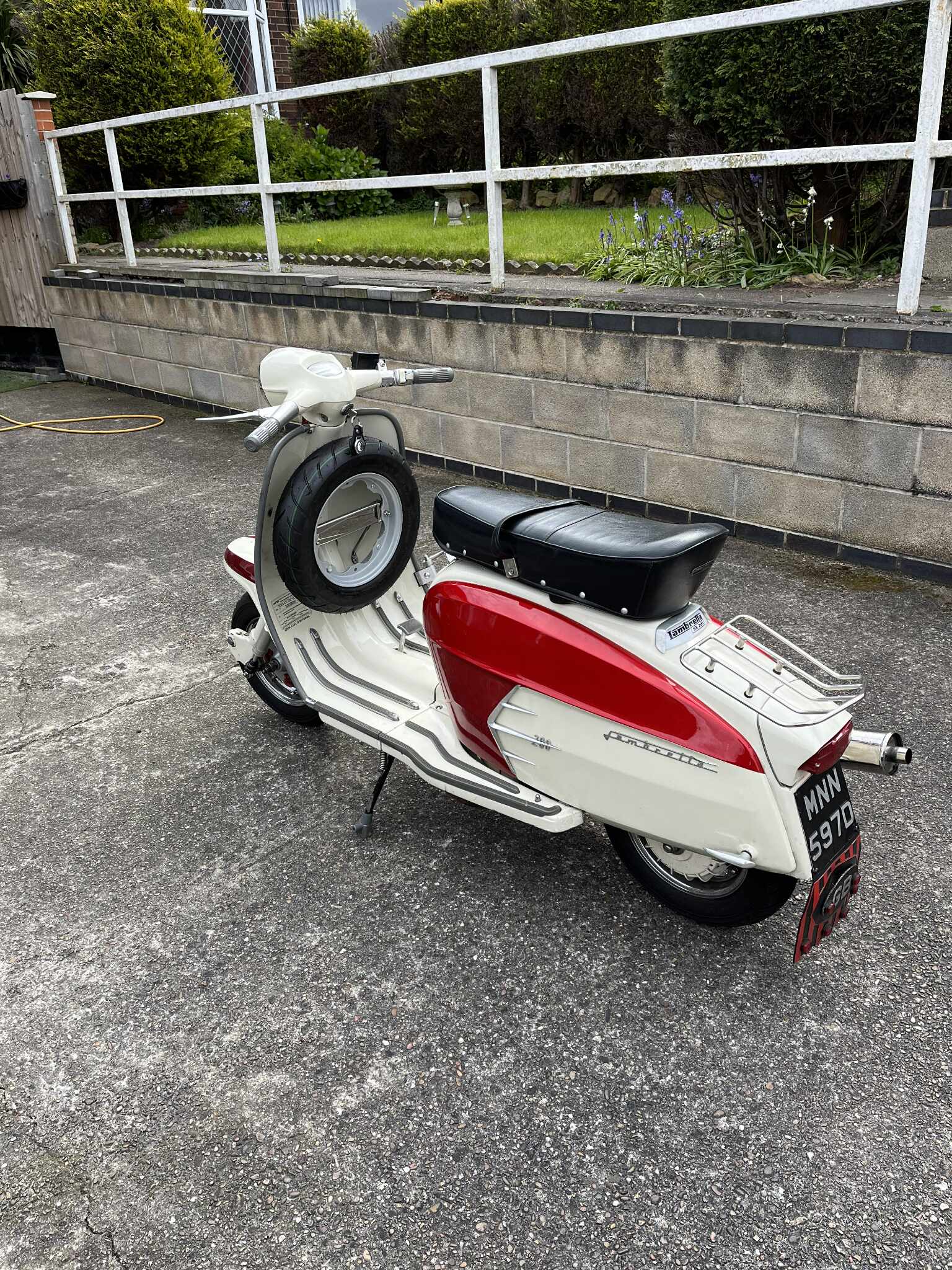 Lambretta LI150 1966, SX200 look alike with GP200 engine (reg as 125) taffy look alike pipe, front disc break, BGM front dampers / shock absorbers. Excellent condition for year. Small holes in leg shield & front mudguard where I removed chrome attachments from. Originally built by Chris King & his team when he had his unit in Nottingham. Historic vehicle, doesn't require MOT, free tax. Viewing by appointment only.
